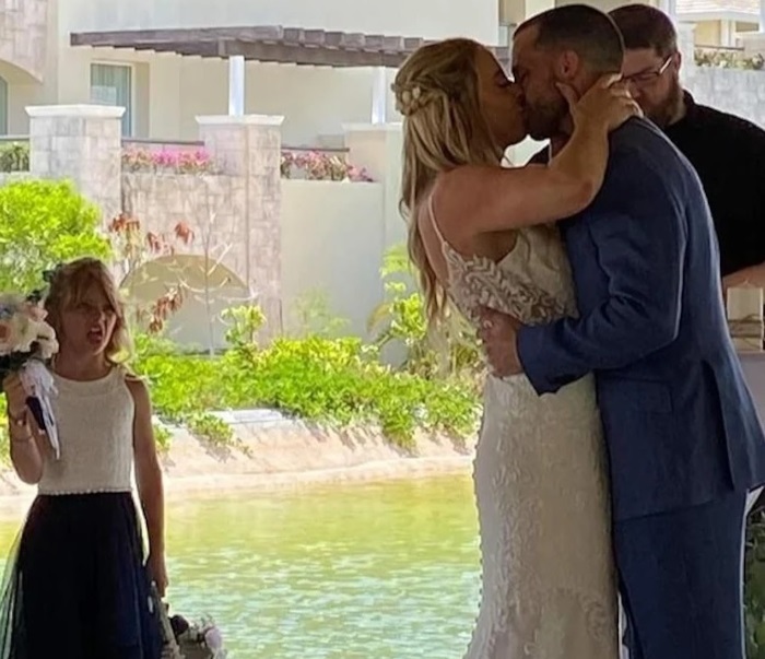 8. Ez a fotó az első hitvesi csókunkat örökítette meg, na meg persze nem mellékesen az unokahúgom reakcióját, akinek szemmel láthatóan nem nyerte el a tetszését a jelenet.