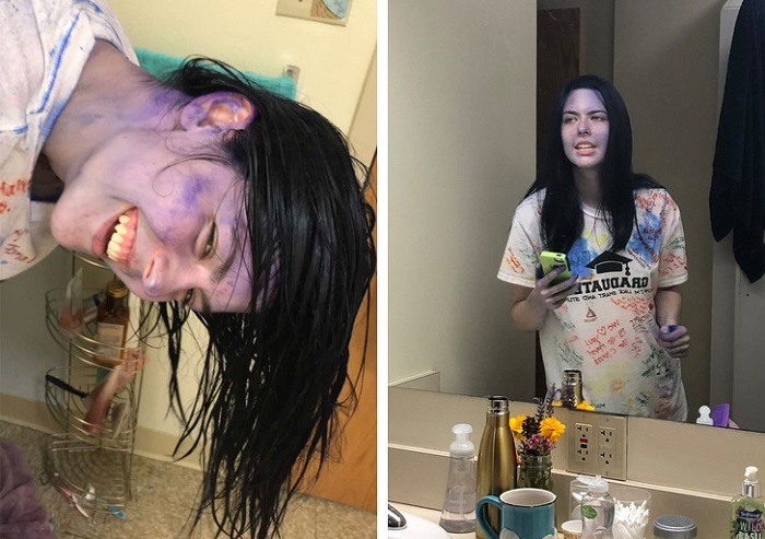 3. A húgom Törpillának öltözött egy halloweeni bulira, ezért befestette kékre az arcát és a kezét is. A festék dobozán az állt, hogy vízzel pillanatok gyorsan és könnyedén lemosható. A húgom mióta hazajött a buliból már vagy 10-szer lezuhanyzott, de még mindig nem sikerült lemosnia a kék festéket magáról.