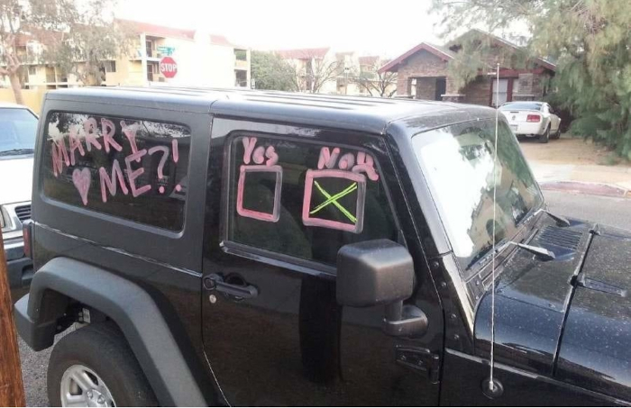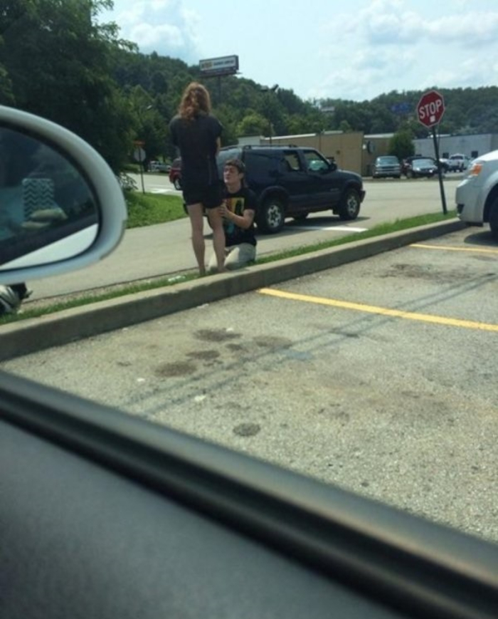 (8) A srác feltehetőleg „sokat” agyalhatott azon, hogy hol kérje meg a barátnője kezét. Végül egy szemetes parkolóra esett a választása. És akkor egyesek még képesek azt állítani, hogy mára már kiveszett a romantika a világunkból.