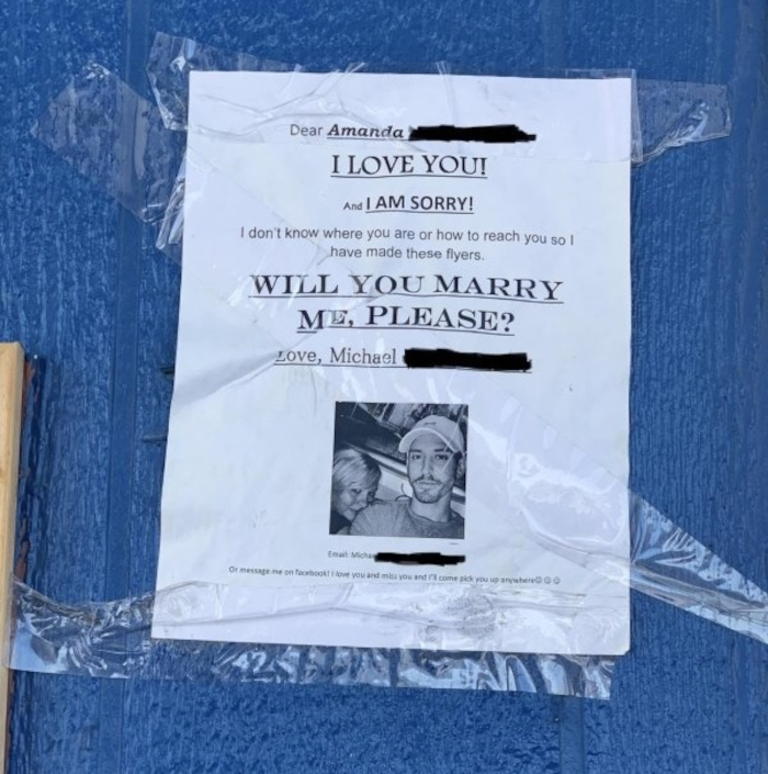 (5) Szöveg: Kedves Amanda! Szeretlek és sajnálom! Nem tudom, hogy hol vagy, és hogy hogyan érhetnélek el, ezért ezekkel az utcai apróhirdetésekkel próbálkozom. Hozzám jössz feleségül?