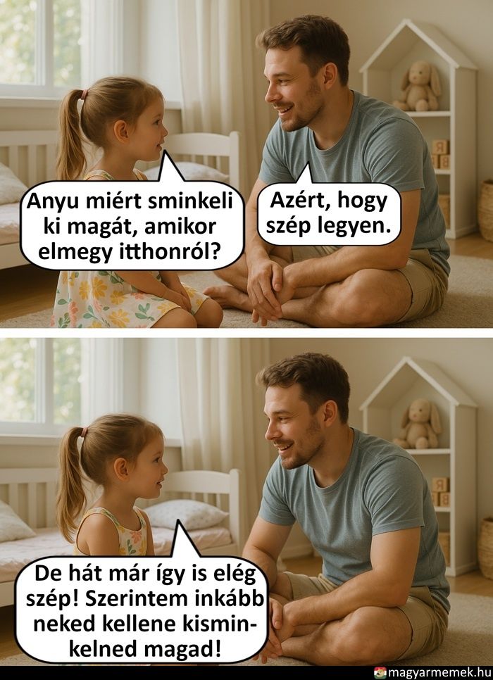 A kislányom: De hát ő már így is elég szép. Apa, inkább neked kellene kisminkelned magad.