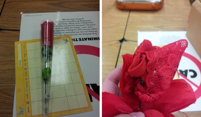 (12) Tanár néni vagyok egy iskolában, és az egyik kisdiák nőnap alkalmából véletlenül egy rózsává hajtogatott bugyit adott nekem ajándékba.