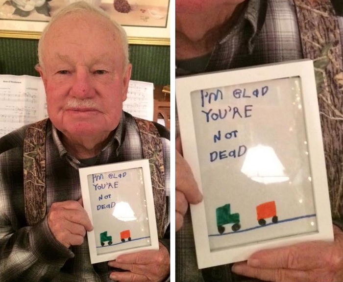 (6) A legőszintébb és leginkább szívből jövő ajándékot a kisunokámtól kaptam a születésnapomra. Ez rajzot, amire ezt írta: „Örülök, hogy nem vagy halott.”