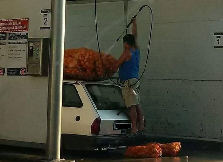 (10) Először nem értettem, hogy mit művel ez a fickó az autómosóban, de aztán rájöttem, hogy egy zseni. Nagyon sok ideig tartana, míg egyesével meghámozná ezt a több zsáknyi újkrumplit, így viszont pillanatok alatt végez vele.
