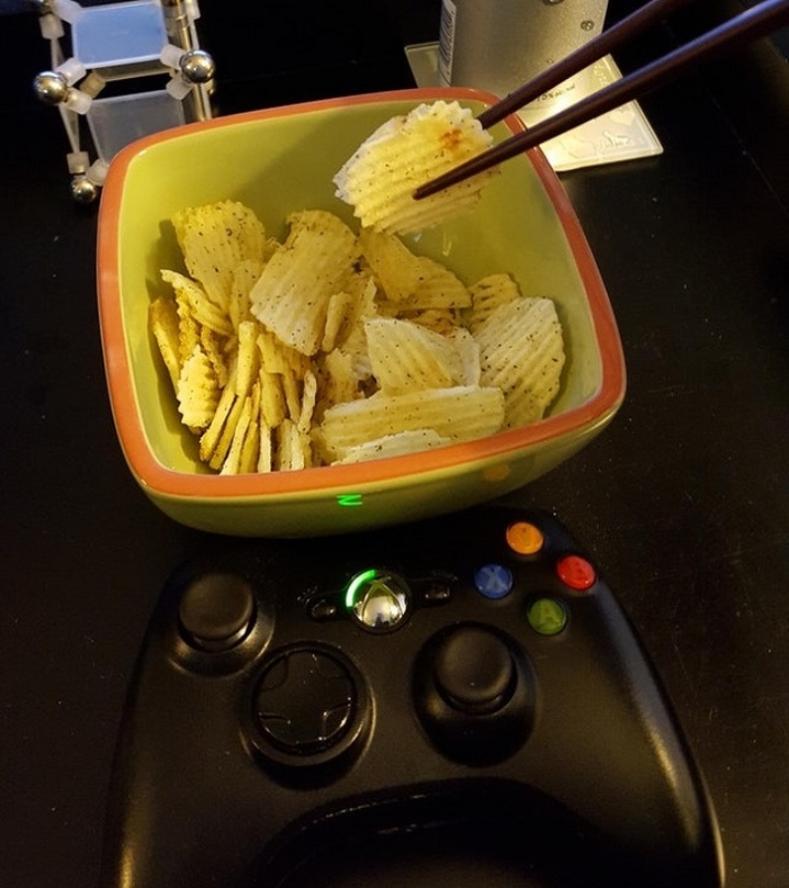 (5) Rájöttem, hogy tévézés és videójátékozás közben hogyan ehetek úgy chipset, hogy ne legyen csupa maszatos és olajos a kezem.