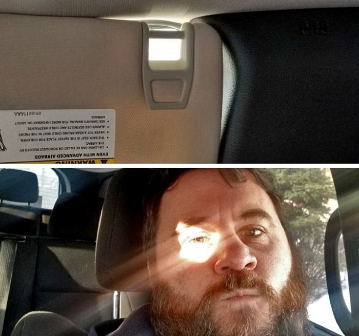 (8) A szemembe sütött a nap a kocsiban, ezért lehajtottam a napellenzőt. Ez a kép mindent elmond arról, hogy úgy általában mekkora szerencsém szokott lenni az életben.