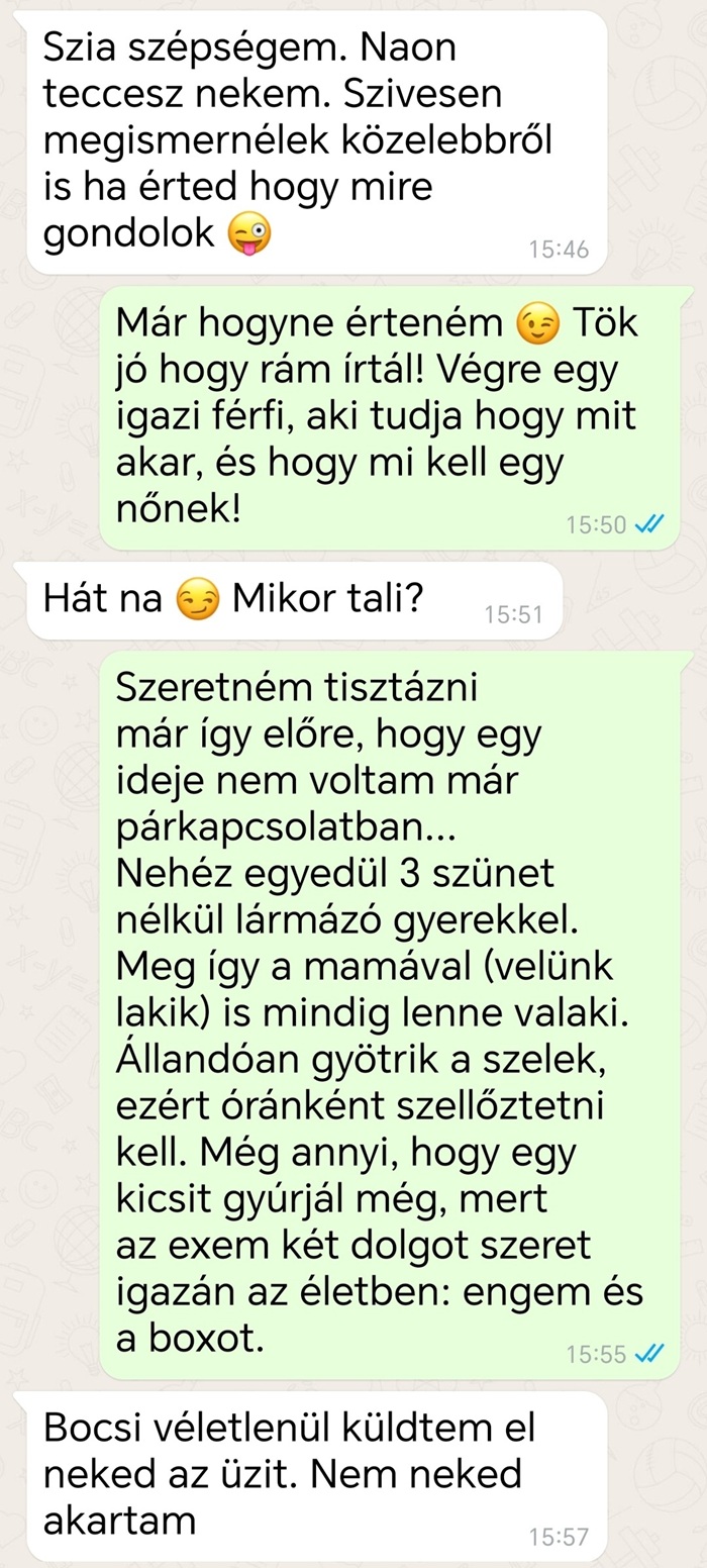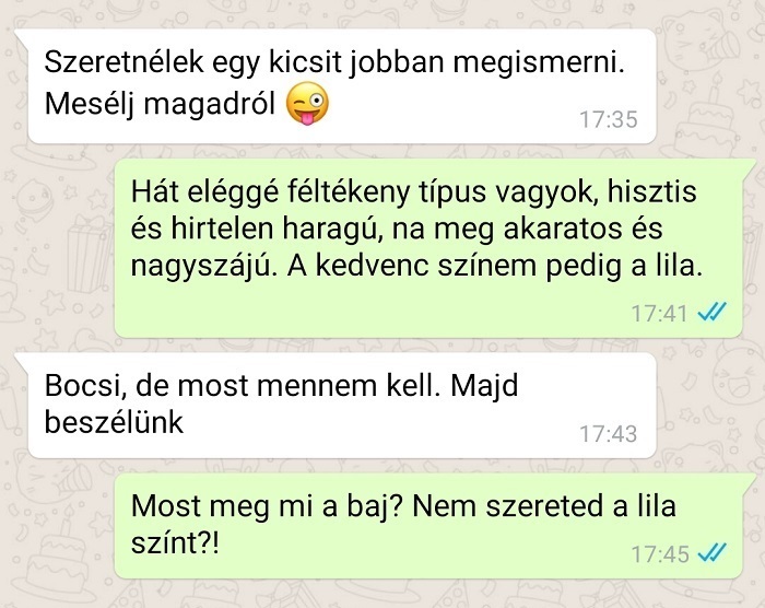 4. Egyeseknek tényleg semmi sem jó. A fickó kérte a hölgyet, hogy meséljen magáról egy kicsit, hogy jobban megismerhesse, erre amikor ez megtörtént, akkor meg nyúlcipőt húzott és lelépett.