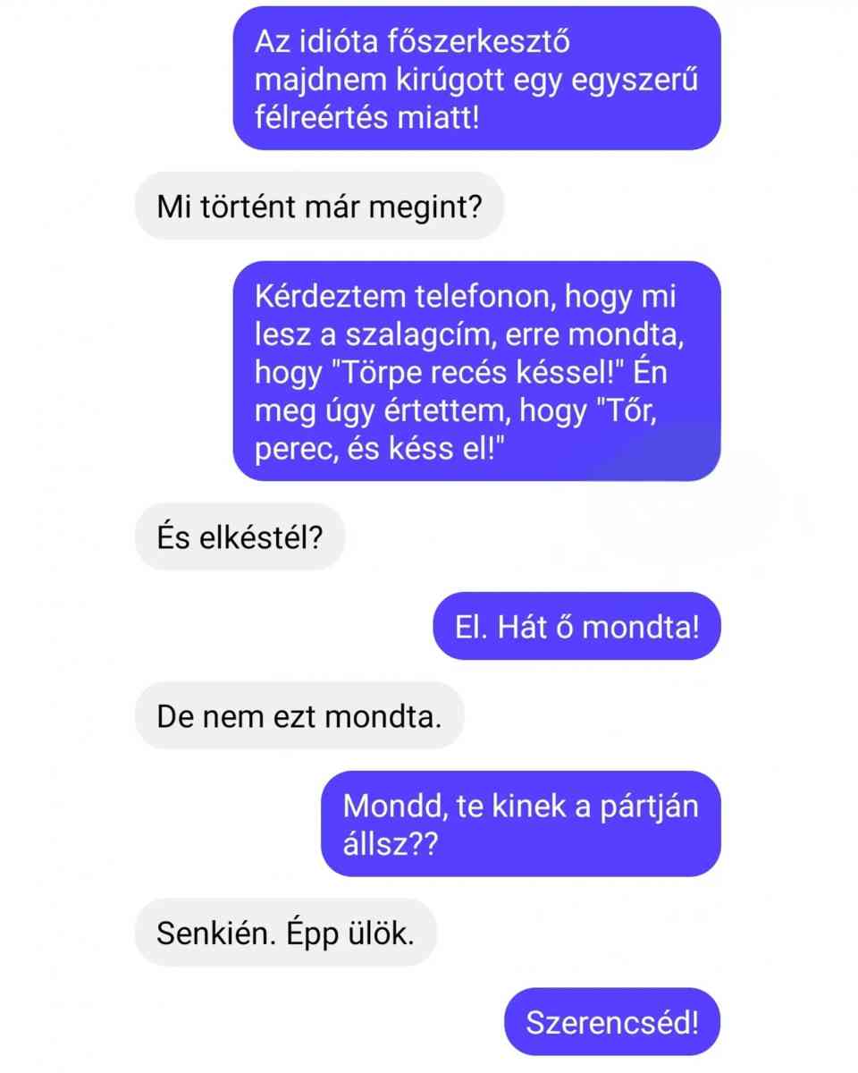 – Képzeld, egy jó tündér megállított ma, és azt mondta választhatok, hogy mit kívánok tőle, mi kell jobban: jó memória, vagy nagy mellek!