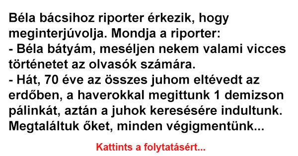 Béla bácsihoz riporter érkezik, hogy meginterjúvolja. Mondja a riporter: – Béla bátyám, meséljen nekem valami vicces történetet az olvasók számára. – Hát, olyan 70 éve az összes juhom eltévedt az erdőben, a haverokkal megittunk 1 demizson pálinkát, aztán a juhok…